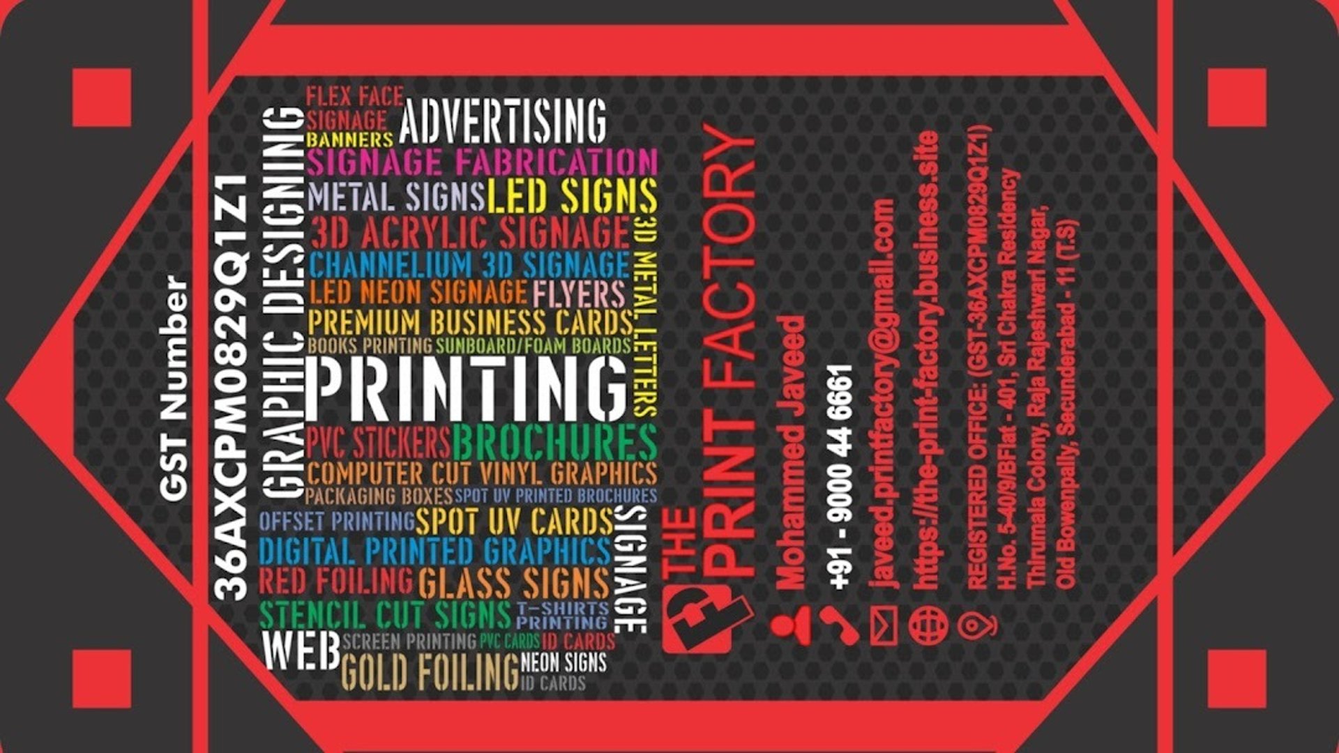 THE PRINT FACTORY is a professional printing facility located in Bowenpally (Secunderabad) Telangana that serves local residents and customers statewide. Beyond normal print shop services, THE PRINT FACTORY can provide customers with complete printing, signage, graphic designing, branding, web designing and many more solutions scaled according to your company’s needs. If you are interested in getting a quote for your print order, contact us or call us at 0091-9000446661.